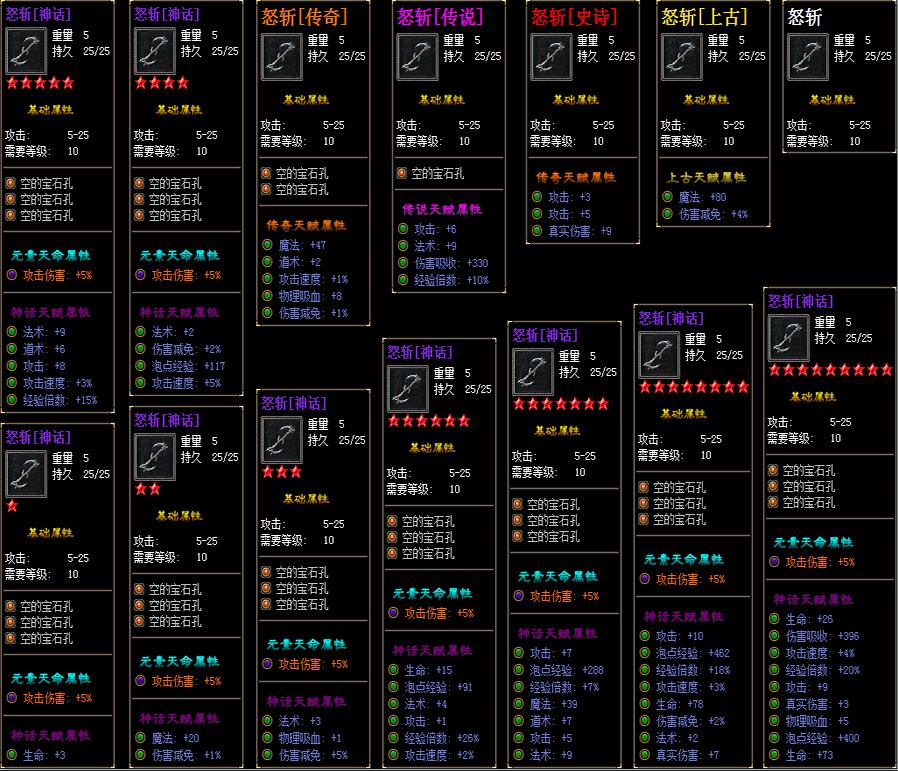 首先来介绍装备品质:普通-精品-上古-史诗-传说-传奇-神话