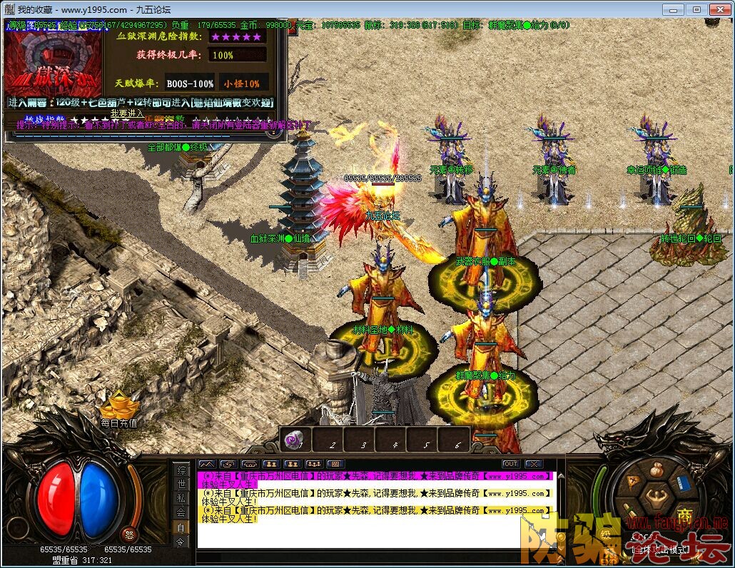 ◆. 非玩家公告→‘所谓的免费’,私服行业本来就是要成本.加上广告越来越贵.开私服的可以100%没免费的.但是我们做的版本是尽量考虑让非RMB玩家也能玩的出激情. 玩的出牛B.只要您肯花点时间.多邀请几个朋友一起更快打东西.没有您打不出的.没有您混不到的.当然RMB玩家也许是比你们快点搞到终极.为了维护开支这也是没办法的 .本服就是RMB玩家.也得花时间去搞装备.只是比您们快点点而已.请理解.因为您们的支持.我们才有继续制作和更新的目标!---- 一切靠打.高回收.尽量免费到底 ◆. 本F广告打出后可能你提前进F的人气没什么,请不要灰心继续游戏,本F又不会跟其他F一样拉家族给待遇加人气.一般人气不是2分钟能涨起来的, 本F也不会挂些死人在安全区凑热闹... ◆. ★由于登陆器加壳,360和金山等杀毒软件可能会误报病毒,请关闭杀软进行游戏,登陆器绝对无毒请放心使用!★ 谨防骗子-游戏里很多自称是GM或卖元宝的,玩家可以试试要他拉你或者刷装备来证明他的身份,现在骗子的方法非常多.请玩家切记!!!最简单的证明方法: 要所谓的GM上线拉人!!! ……更多游戏特色及内容请进游戏查看…… 好服真难找,遇到她就别错过她!